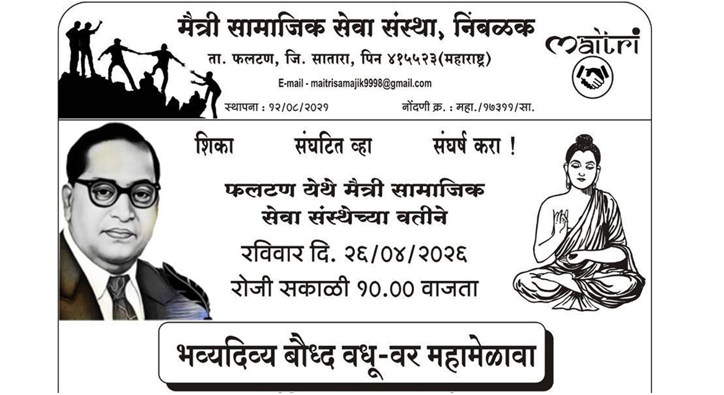 शिक्षण आणि सामाजिक बांधिलकीचा वारसा जपत, फलटण येथे मैत्री सामाजिक सेवा संस्था, निंबळक यांच्या वतीने भव्यदिव्य ‘बौद्ध वधू-वर महामेळाव्या’चे आयोजन करण्यात आले आहे. हा मेळावा रविवार, दिनांक २६ एप्रिल २०२६ रोजी सकाळी १०:०० वाजता कोळकी येथील संगम हॉटेल (फलटण-दहिवडी रोड) येथे संपन्न होणार आहे. समाजातील सुशिक्षित व विविध क्षेत्रांतील वधू-वरांना एकाच व्यासपीठावर आणून त्यांचे लग्न जमवण्यासाठी सहकार्य करणे, हा या उपक्रमाचा मुख्य उद्देश आहे.